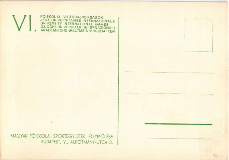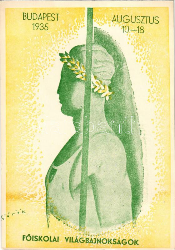 1935 Budapesti VI. Főiskolai Világbajnokságok reklámlapja. Magyar Főiskolai Sportegyletek Egyesülése / 6th College Sports Championship, University International Games in Budapest, advertisement card s: N. Török (vágott / cut)