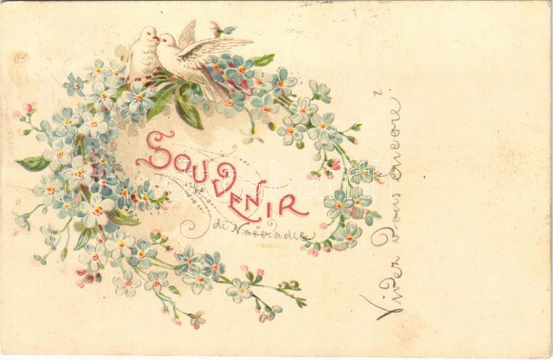 1900 Souvenir. Floral litho greeting card with doves https://www.darabanth.com/hu/498-Gyorsarveres/498.0/Kepeslapok/Udvozlolapok-Unnepek~3000106/1900-Souvenir-Floral-litho-greeting-card-with-doves~II2321711