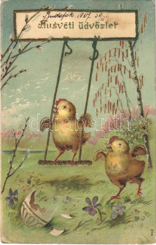1907 Húsvéti üdvözlet / Easter greeting art postcard, chicken. Emb. li... https://www.darabanth.com/hu/498-Gyorsarveres/498.0/Kepeslapok/Udvozlolapok-Unnepek~3000106/1907-Husveti-udvozlet-Easter-greeting-art-postcard-chicken-Emb-litho-EK~II2325224