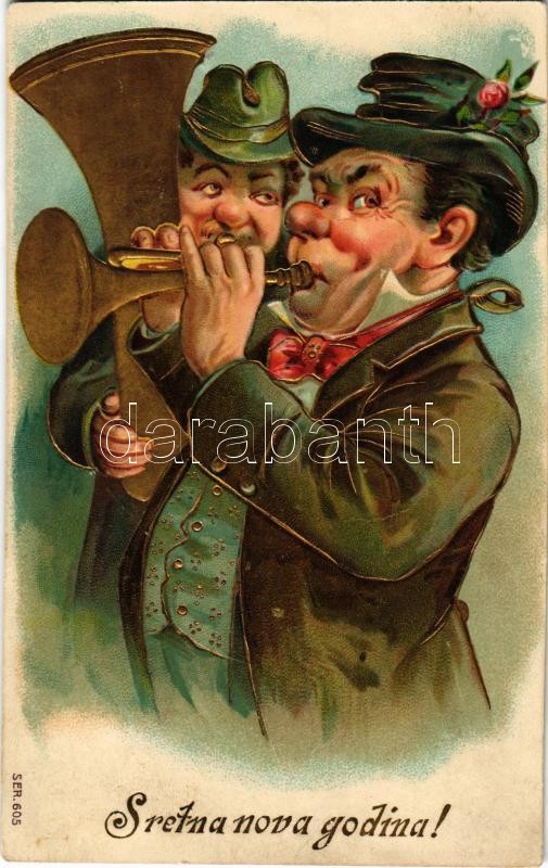 1909 Sretna nova godina! / Croatian New Year greeting card with musici... https://www.darabanth.com/hu/498-Gyorsarveres/498.0/Kepeslapok/Udvozlolapok-Unnepek~3000106/1909-Sretna-nova-godina-Croatian-New-Year-greeting-card-with-musicians-Ser-605-Emb-litho~II2162925