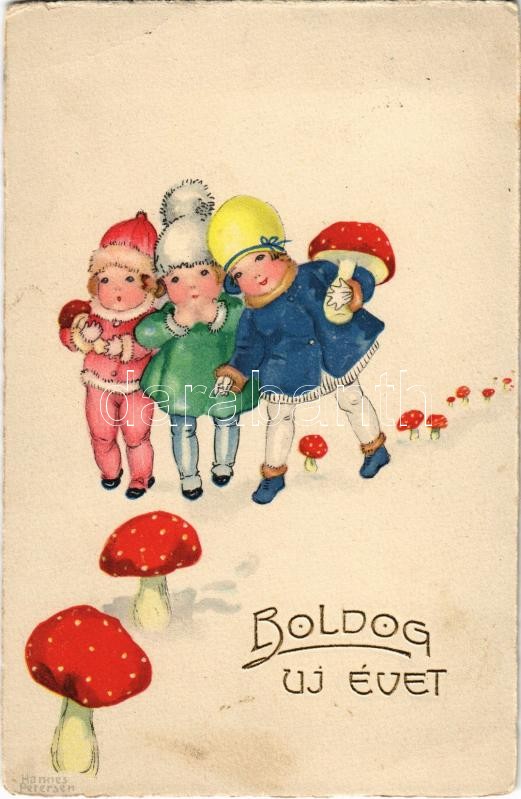 1940 Boldog Újévet! / New Year greeting card, children with mushrooms.... https://www.darabanth.com/hu/498-Gyorsarveres/498.0/Kepeslapok/Udvozlolapok-Unnepek~3000106/1940-Boldog-Ujevet-New-Year-greeting-card-children-with-mushrooms-HWB-Alabaster-Serie-3848~II2160524