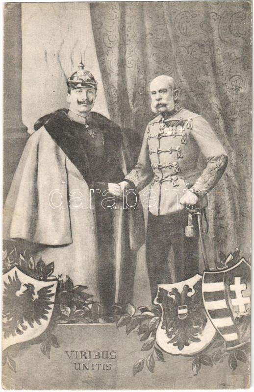 1915 Franz Joseph I of Austria and Wilhelm II, German Emperor. Viribus... https://www.darabanth.com/hu/498-Gyorsarveres/498.0/Kepeslapok/Uralkodo-Politikus~3000103/1915-Franz-Joseph-I-of-Austria-and-Wilhelm-II-German-Emperor-Viribus-Unitis-propaganda-coat-of-ar~II2334338