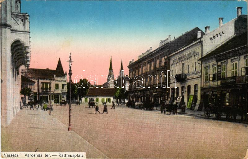 Leírás: 1915 Versec, Vrsac; Városház tér, szálloda, mozi, üvegudvar. Gábor Lajos kiadása / square, hotel, cinema, shops (fl)