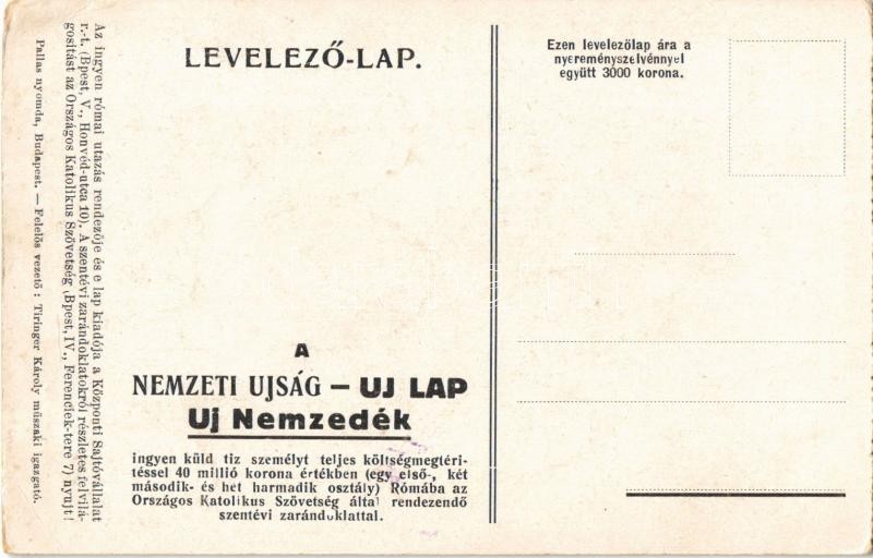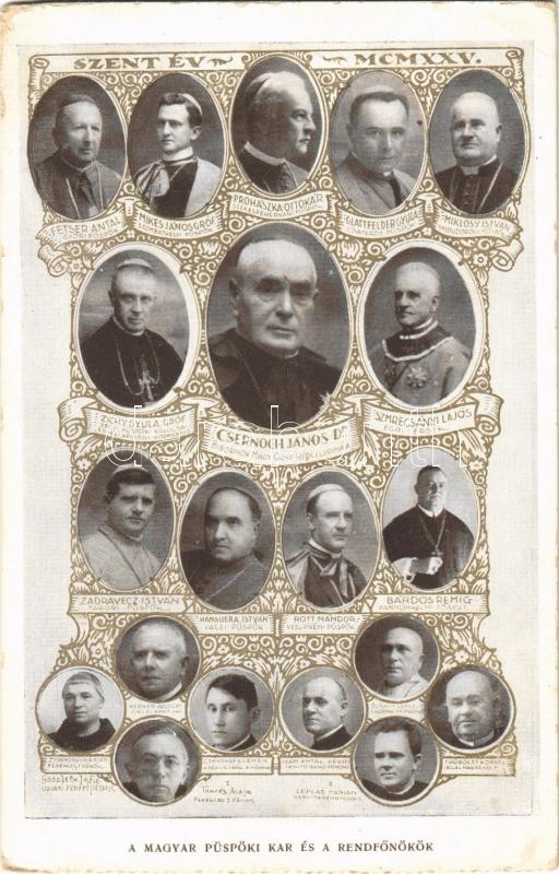 A Magyar Püspöki Kar és a rendfőnökök; Dr. Csernoch János bíboros-hercegprímás, Prohászka Ottokár püspök, Zichy Gyula gróf, Szmrecsányi Lajos érsek, Zadravecz István tábori püspök, stb. Az 1925-ös Szent év alkalmából kiadott képeslap; hátoldalon Nemzeti Újság reklám / Hungarian Catholic Bishops' Conference (kopott sarkak / worn corners)
