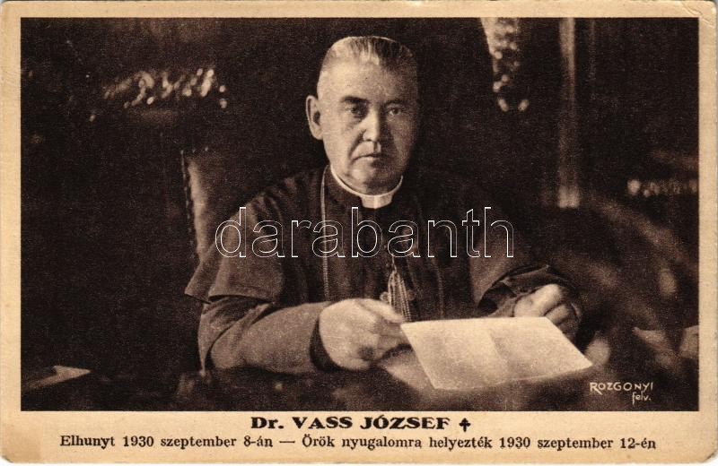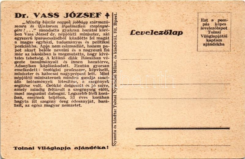 Dr. Vass József, gyászlap. Rozgonyi felvétele. Tolnai Világlapja ajándéka / Hungarian politician, who served as Minister of Religion and Education. Obituary card (EK)