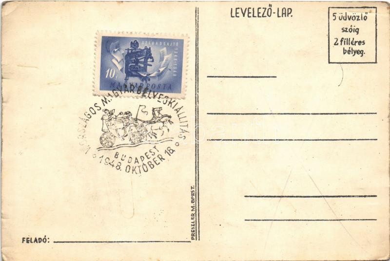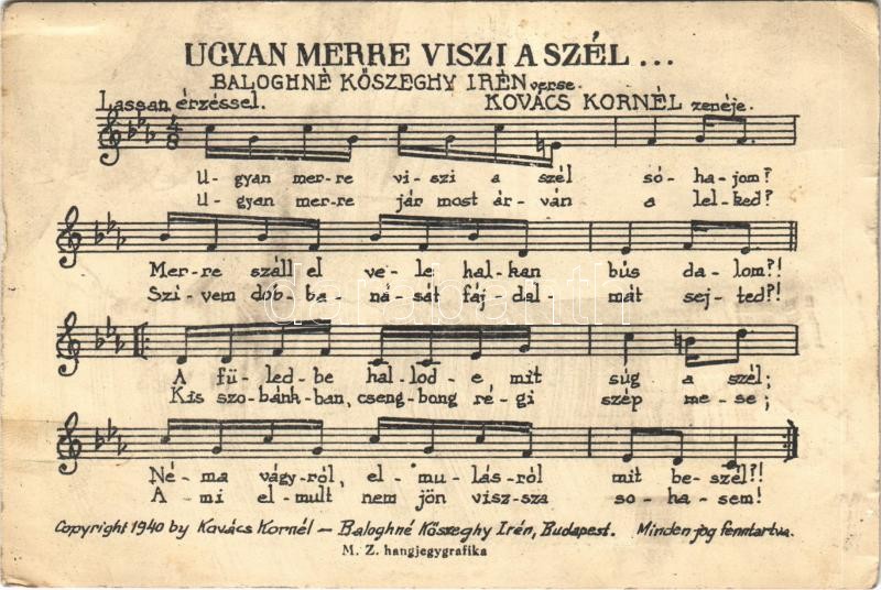 Ugyan merre viszi a szél... Baloghné Kőszeghy Irén verse. Kovács Kornél zenéje. M. Z. hangjegygrafika + "V. Országos Magyar Bélyegkiállítás Budapest 1948. október 18." So. Stpl. (EK)