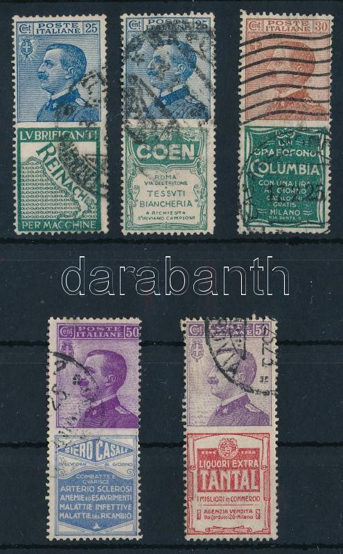Leírás: Olaszország 1924/1925 5 db klf Reklámos bélyeg Mi 90/R4, 90/R8, 133/R1, 92/R9, 92/R11 (Mi EUR 170.-)