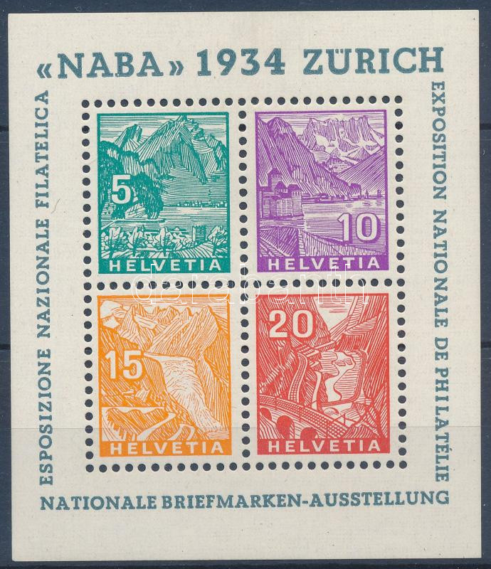 Leírás: Svájc 1934 NABA bélyegkiállítás blokk Mi 1. Certificate: Diena (Mi EUR 750.-)