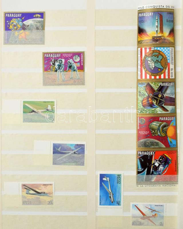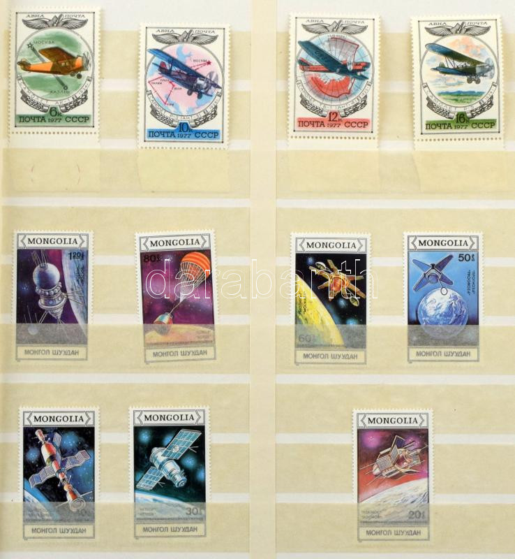 Leírás: 20 lapos nagyalakú Schaubek rugós berakó osztott lapokkal, benne NDK gyűjtemény + szovjet, mongol, Paraguay, főleg űrkutatás motívum bélyegek