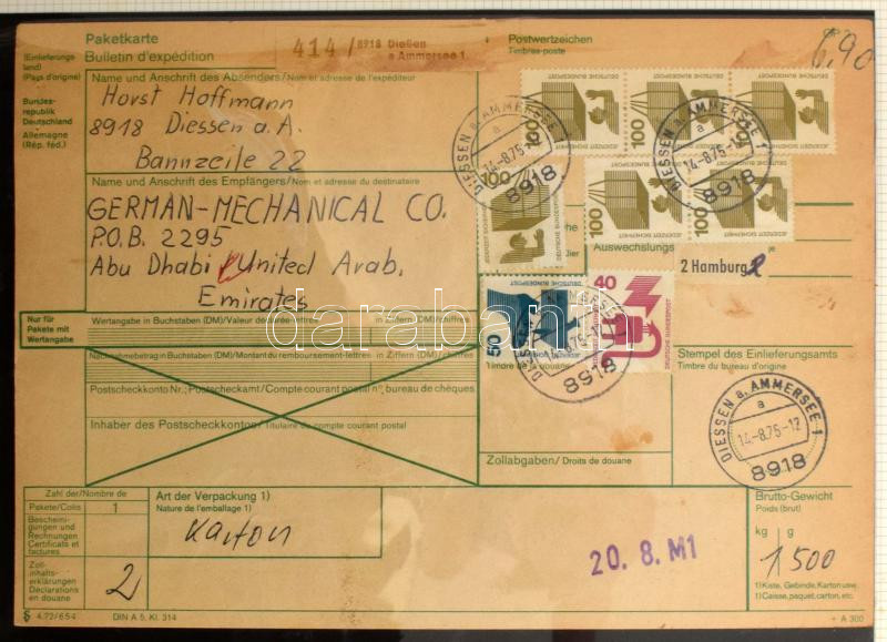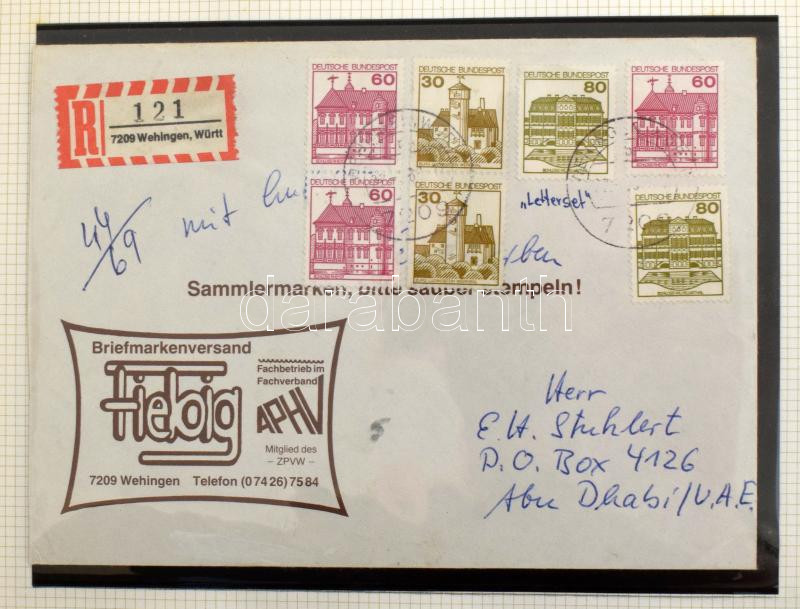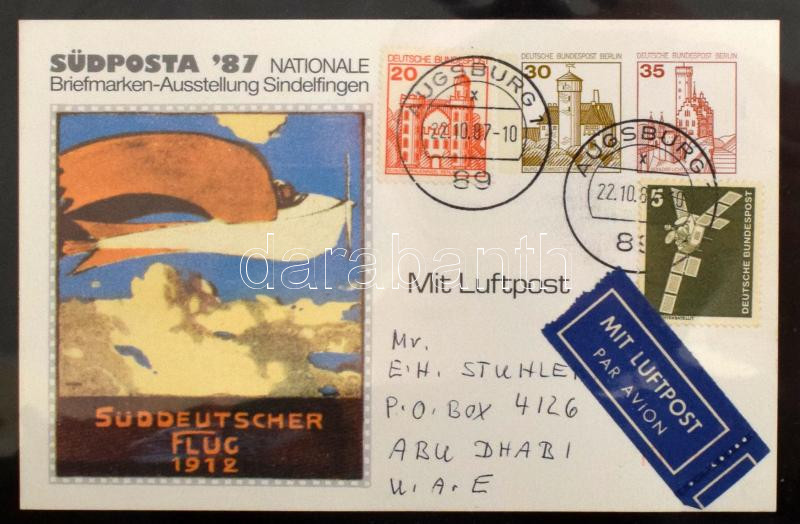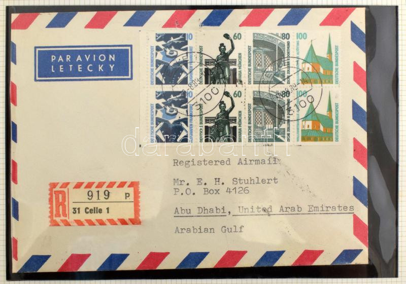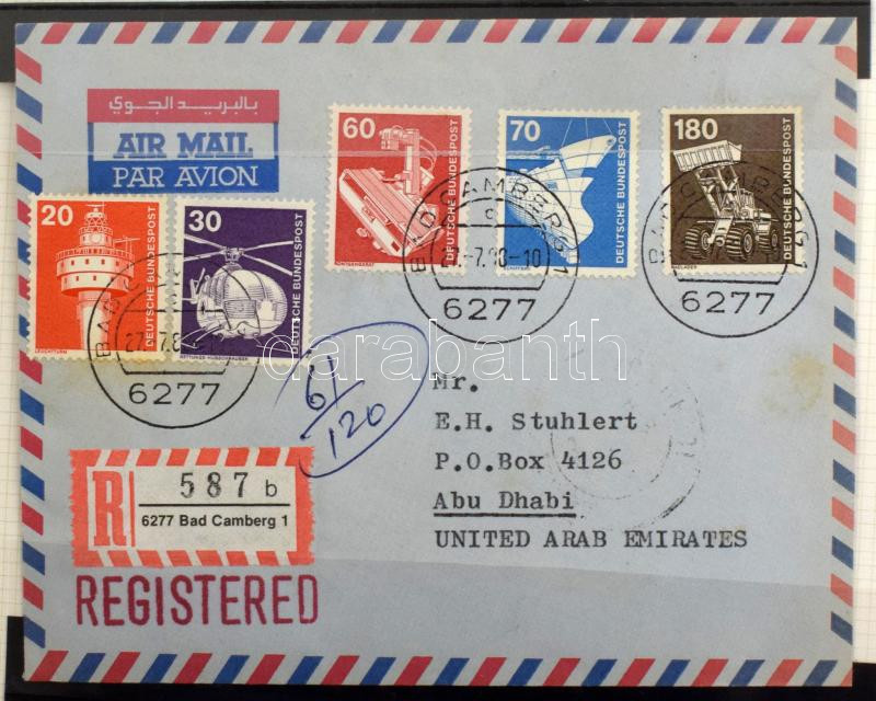 Leírás: NSZK levélgyűjtemény Prinz albumban. A levelek mind Abu Dhabiba mentek, főleg alánlott légi levelek érdekes bérmentesítésekkel