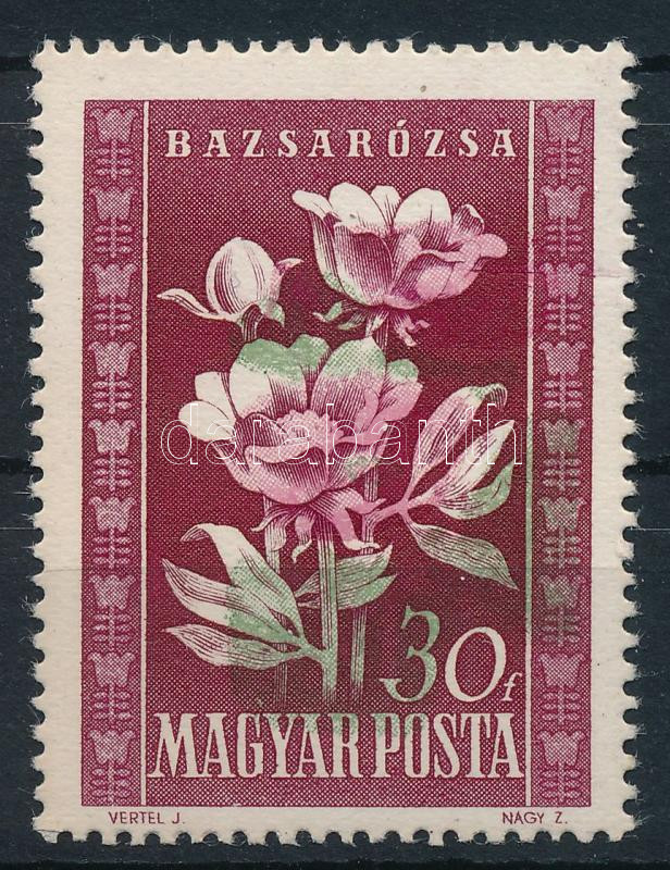 Leírás: 1950 Virág (I.) 30f eltolódott zöld és rózsaszín színnyomattal (ránc / crease)