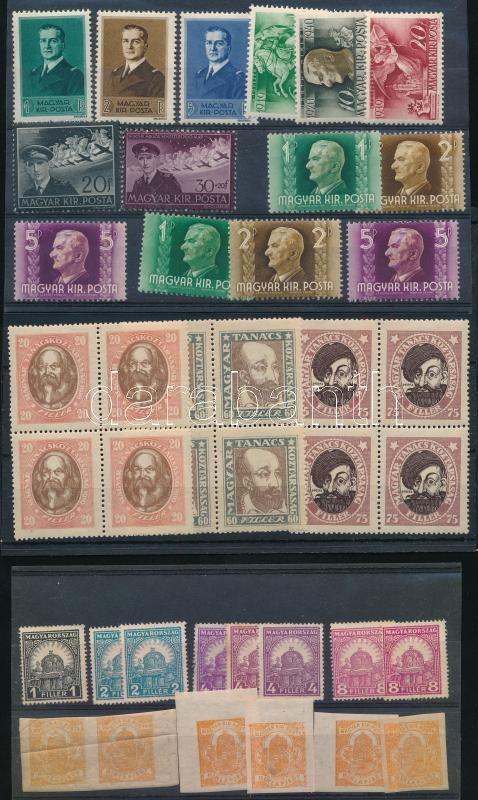 Kis tétel benne Pengő fillér értékek, Hírlapbélyeg, Horthy bélyegek, Magyar Tanácsköztársaság 20f, 60f, 75f érték négyestömben álló vízjellel, 20f kis fehér folttal