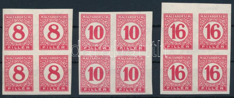 Leírás: 1929 Pengő-filléres portó II. 3 értékes ívszéli vágott sor vékony papíron négyestömbökben (60.000) (gumihiba, ráncok / gum disturbance, creases)