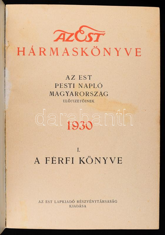 1930 Az Est hármaskönyve I-III. köt. Szerk.: Mikes Lajos. I. köt.: A férfi. II. köt.: A nő. III. köt.: A gyermek. Bp., 1930.,Est, (Athenaeum-ny.), 319+1 p.; 319+1 p.; 191+1 p. Gazdag képanyaggal illusztrált. Kiadói illusztrált papírkötések, kissé kopott borítókkal, enyhén foltos gerincekkel. + Az Est hármaskönyve 1933. A Jókedv Könyve. Bp., 1933, Est. Gazdag képanyaggal. Kiadói papírkötés.