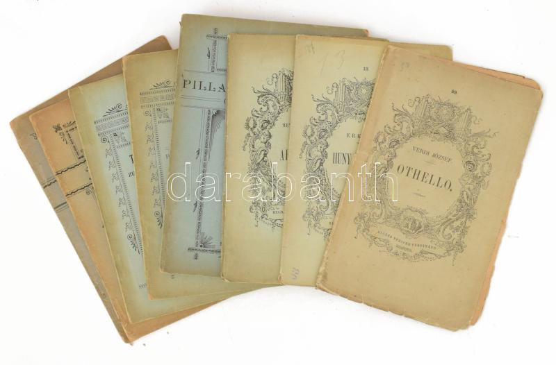 A Magyar Kir. Operaház opera füzetei 7 db: Csavargó és királylány, Mária, Tristán és Izolde, Onegin, Pillangó kisasszony, Hunyadi László, Afrikai nÅ‘, Otthelo. Bp., 1887-1906. Kiadói papÃrborÃtókkal, nagyrészt jó állapotban