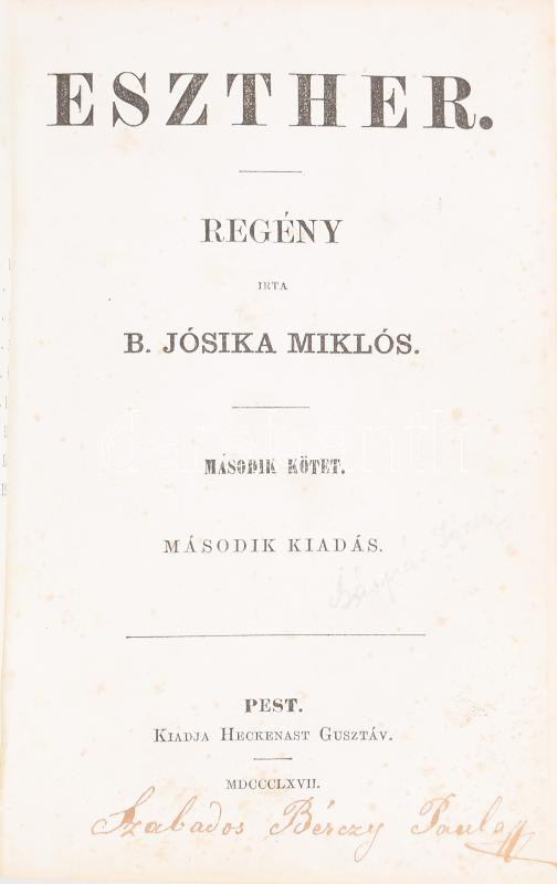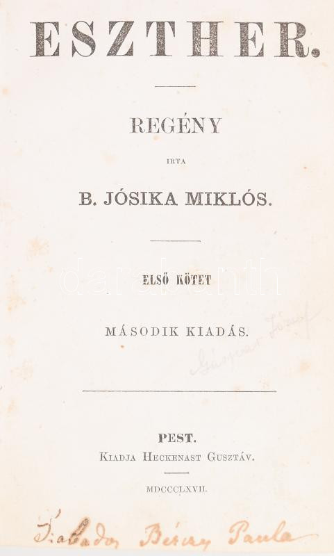 B. Jósika Miklós: Eszther I-II. köt. Regény. Pest, 1867., Heckenast Gu... https://www.darabanth.com/hu/498-Gyorsarveres/498.0/Konyvek/Konyvek-Egyeb-ritkasagok~3000130/B-Josika-Miklos-Eszther-I-II-kot-Regeny-Pest-1867-Heckenast-Gusztav-4plus210plus1-plus4plus220-p-~II3400974