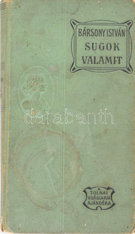Leírás: Bársony István: Sugok valamit. Elbeszélések. Bp.,[1908],Magyar Kereskedelmi Közlöny, 136 p. Kiadói egészvászon-kötés, kopott, foltos borítóval, a gerincen kis sérüléssel, foltos lapokkal.