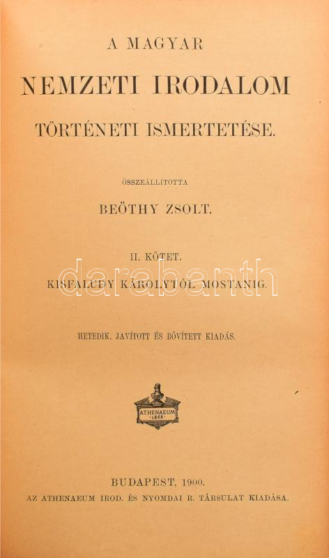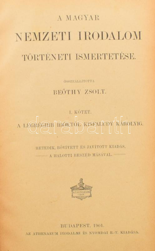 Beöthy Zsolt: A magyar nemzeti irodalom történeti ismertetése I-II. köt. I. kötet. A legrégibb időktől Kisfaludy Károlyig. II. köt.: Kisfaludy Károlytól mostanig. Bp., 1901, Athenaeum, 1 t. + 394 p.+1 t.+ 414 p. 7., bővített és javított kiadás. Korabeli átkötött aranyozott egészvászon-kötés, kopott borítóval.