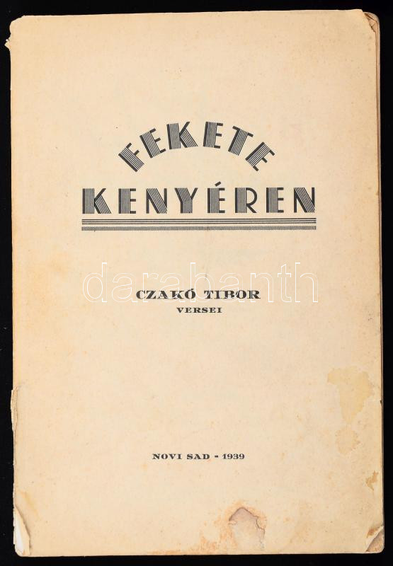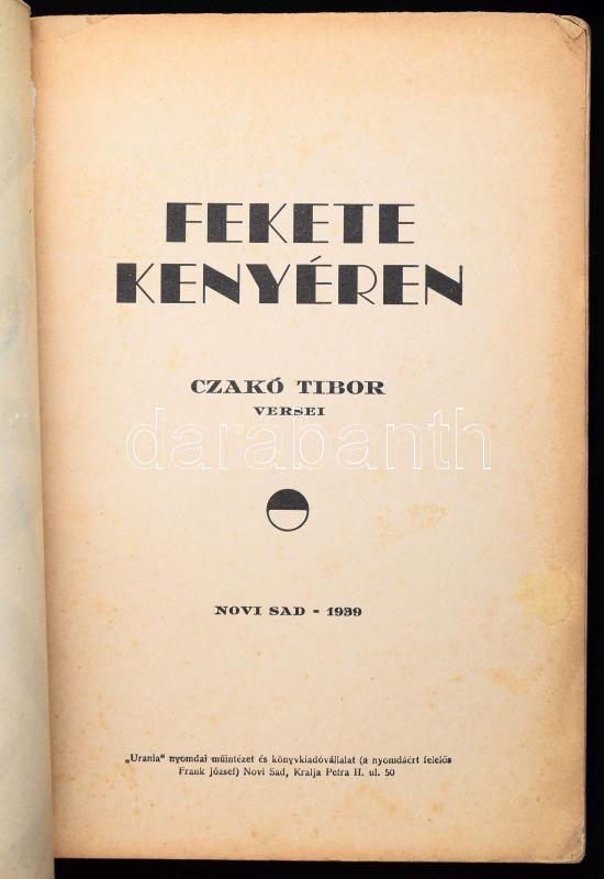 Czakó Tibor: Fekete kenyéren. - - versei. Novi Sad [Újvidék], 1939, &q... https://www.darabanth.com/hu/498-Gyorsarveres/498.0/Konyvek/Konyvek-Egyeb-ritkasagok~3000130/Czako-Tibor-Fekete-kenyeren--versei-Novi-Sad-Ujvidek-1939-Urania-ny-94-p-Kiadoi-~II3401057