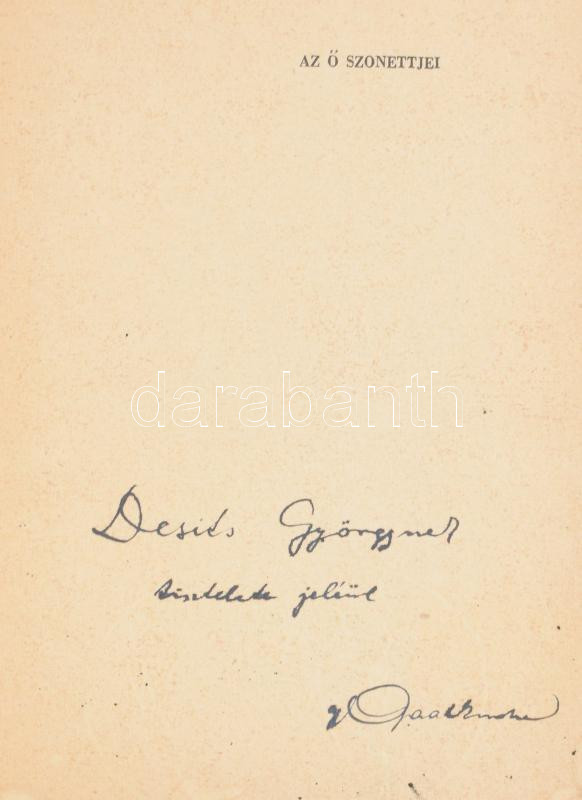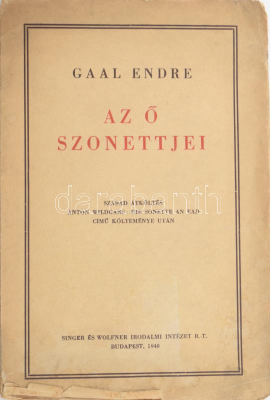 Gaal Endre: Az ő szonettjei. Anton Wildgans ,,Die Sonette an Ead" című költeménye után szabad átköltés. (Dedikált!) Bp., [1940], Singer és Wolfner, 39+(1) p. Egyetlen kiadás. Kiadói papírkötés, sérült, kissé foltos borítóval, helyenként kisebb lapszéli foltokkal. A szerző által Desits György részére dedikált példány.