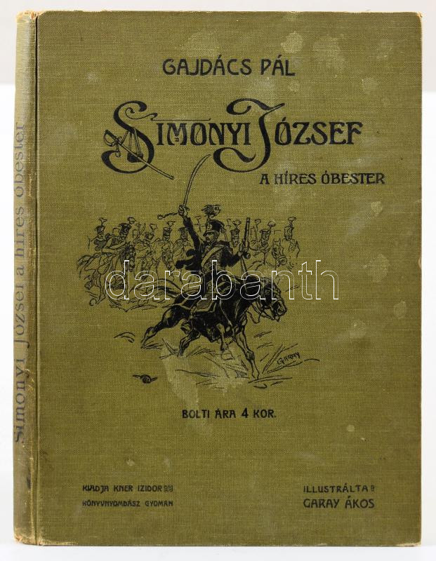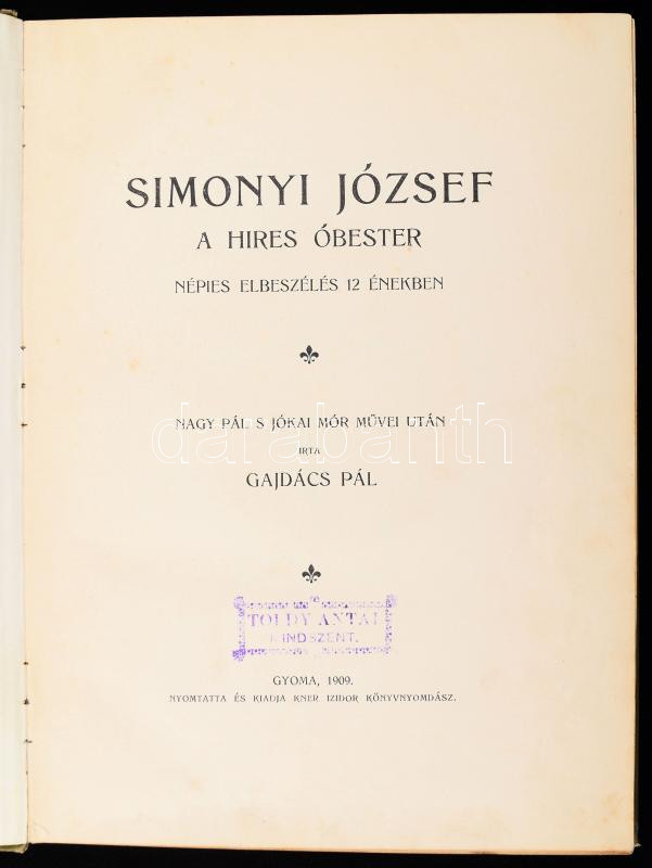 Leírás: Gajdács Pál: Simonyi József a híres óbester. Népies elbeszélés 12 énekben. Garay Ákos illusztrációival. Gyoma, 1909, Kner Izidor. Kiadói kissé sérült, illusztrált egészvászon-kötés, tulajdonosi bélyegzővel.