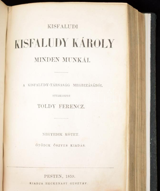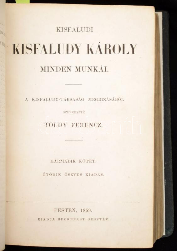 Kisfaludi Kisfaludy Károly minden munkái. I., II-IV. köt. [Egy kötetben.] A Kisfaludy-Társaság megbizásából szerkeszté: Toldy Ferencz. Pest, 1859, Heckenast Gusztáv, 200 p.; 228+1 p.; 206+1 p. Ötödik öszves kiadás. Félvászon-kötés, kopott borítóval, az első lap javított, foltos lapokkal, a címlapon bejegyzéssel, hiányzó címképpel.