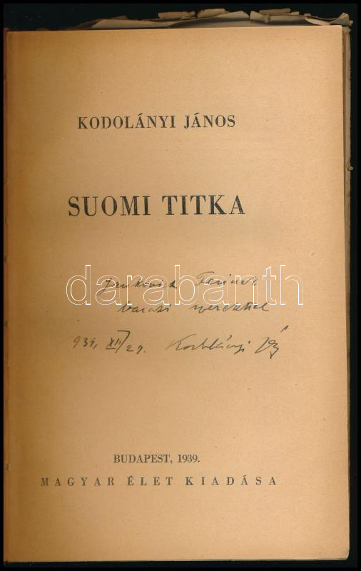 Leírás: Kodolányi János: Suomi titka. DEDIKÁLT Jankovich Ferencnek. Bp., 1939, Magyar Élet. Kiadói papírkötés, papír védőborítóval, kopottas állapotban.