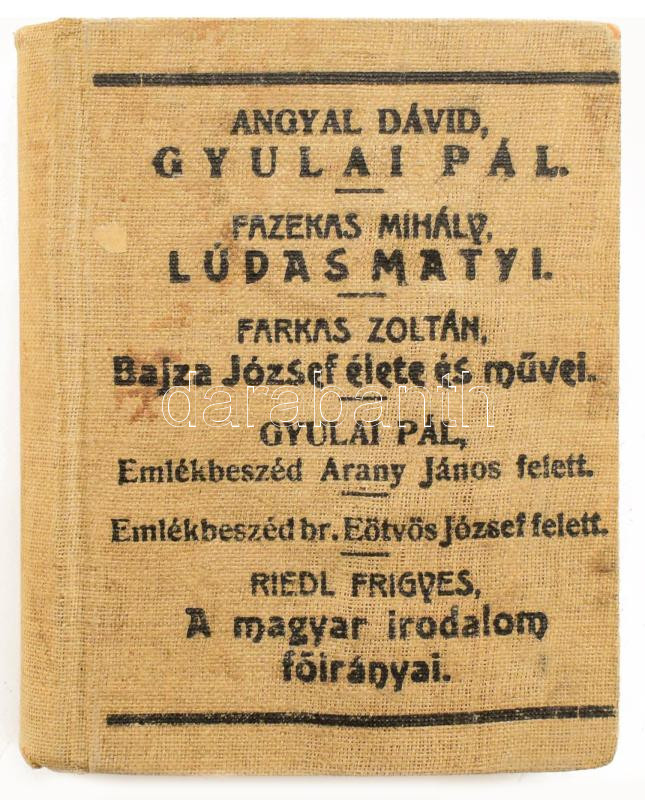 Kolligátum Olcsó Könyvtáras művekből: Angyal Dávid: Gyulai Pál. Fazekas Mihály: Lúdas Matyi. Farkas Zoltán: Bajza József élete és művei. Gyulai Pál: Emlékbeszéd Arany János felett. Emlékbeszéd br. Eötvös József felett. Riedl Frigyes: A magyar irodalom fő irányai. Bp., 1901-1912, Franklin. Átkötött egészvászon-kötés.
