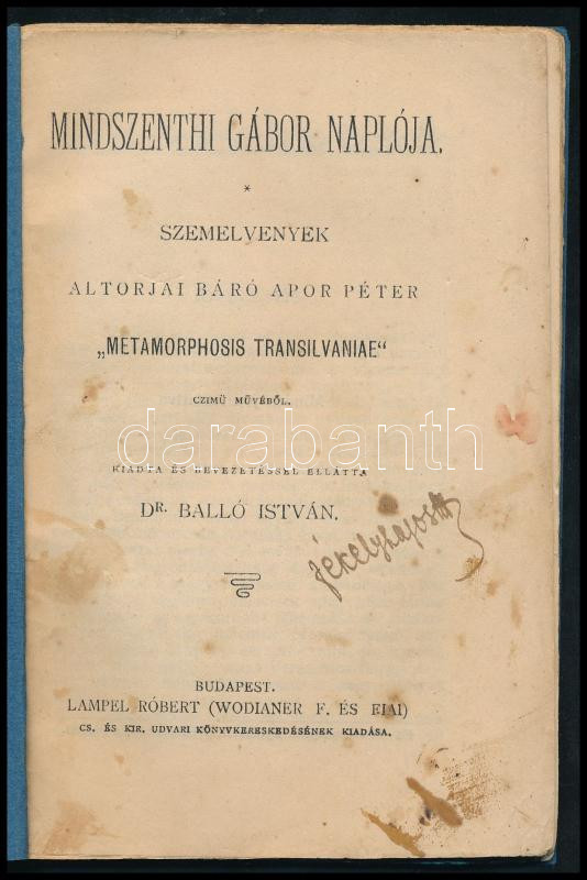 Mindszenthi Gábor naplója. Szemelvények Altorjai Báró Apor Péter "Metamorphosis Transilvaniae" czímű művéből. Kiadta és bev. ellátta: Balló István. Bp., 1900, Lampel R. (Wodianer F. és Fiai), Jékely Lajos (Áprily Lajos) névbejegyzéssel. Papírkötésben, kissé kopottas állapotban.