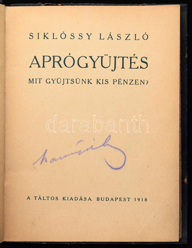 Siklóssy László: Aprógyűjtés. Mit gyűjtsünk kis pénzen? Bp., 1918, A Táltos kiadása. 90+6 p. Számos szövegközi illusztrációval. Átkötött félvászon-kötés, kopott, foltos borítóval, sérült hátsó táblával, hiányzó hátsó szennylappal.