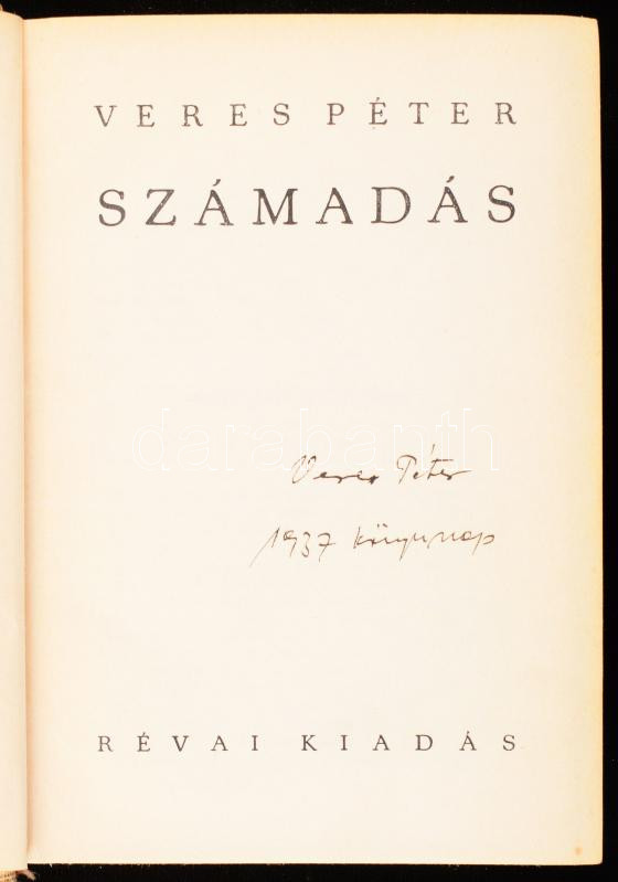 Veres Péter: Számadás. ALÁÍRT! Első kiadás. Bp., 1937, Révai. Kiadói e... https://www.darabanth.com/hu/498-Gyorsarveres/498.0/Konyvek/Konyvek-Egyeb-ritkasagok~3000130/Veres-Peter-Szamadas-ALAIRT-Elso-kiadas-Bp-1937-Revai-Kiadoi-egeszvaszon-kotes-~II3401979