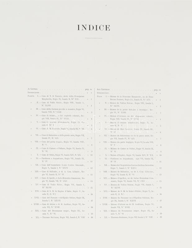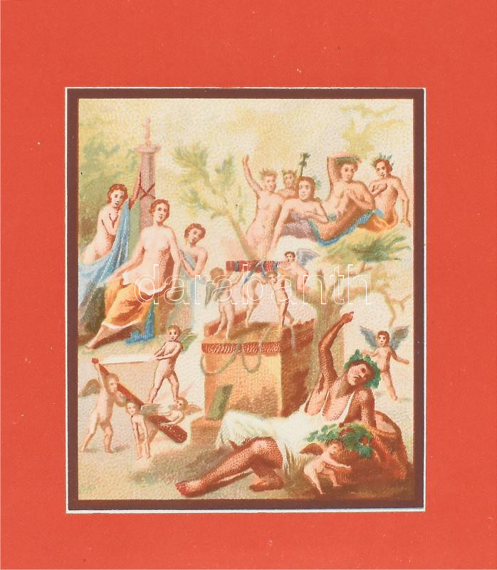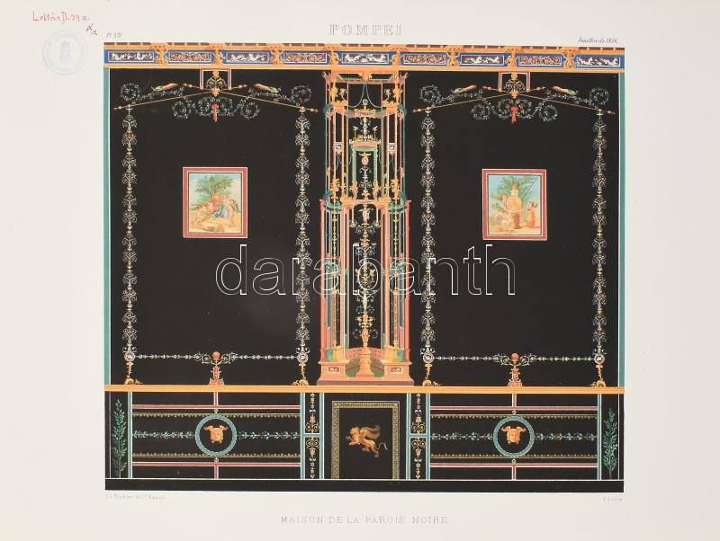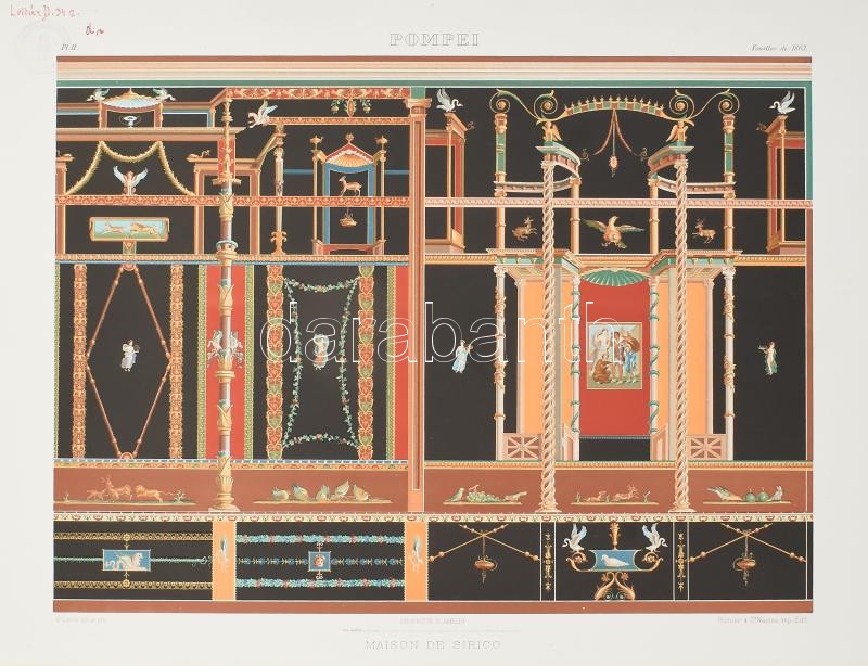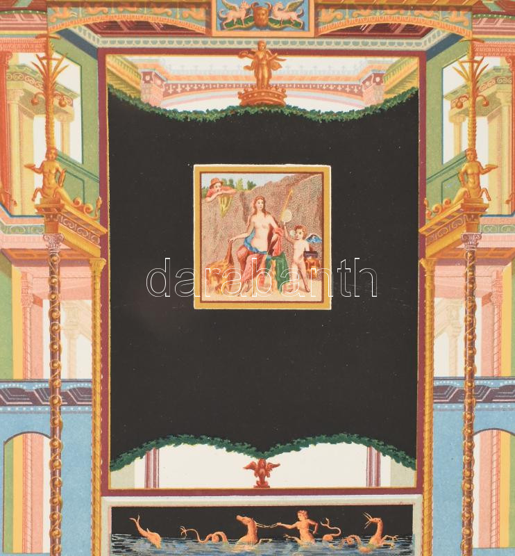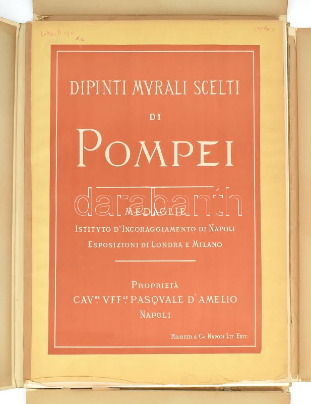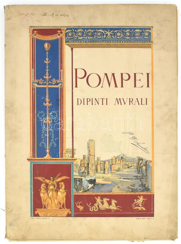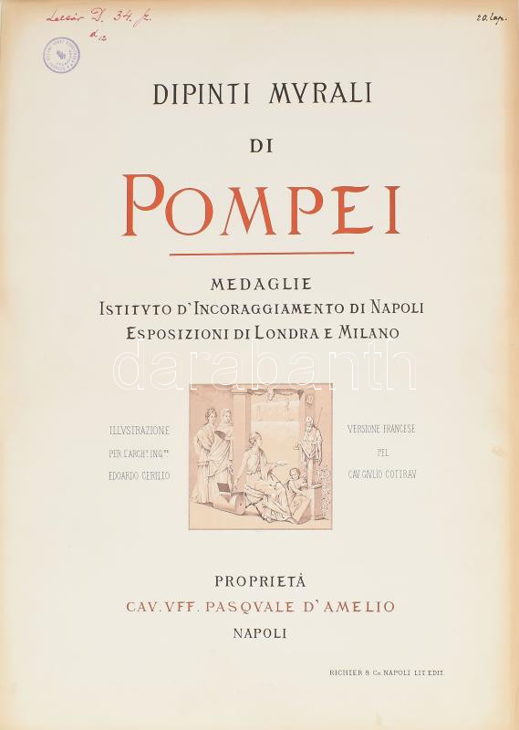 Dipinti Murali Scelti di Pompei. Medaglie Istituto d'Incoraggiamento di Napoli Esposizioni de Londra e Milano. Illustrazione per l'Arch. Ingre Edoardo Cerillo. Versione francese pel cav. Giulio Cottrau. Napoli, [1886],Pasquale d'Amelio, (Napoli, Richter & C.-ny.),IX+1+20 p.+20 (Pompei falfestmények, kromolitográfiák) t. Olasz és francia nyelven. A litográfiák Vincenzo Loria (1850-1939) munkái. Kiadói festett illusztrált egészvászon-mappa, kopott, foltos borítóval, a gerincen sérüléssel, a mappa alsó fülén sérüléssel, a mappa fülein lévő zsinórokon sérülésekkel, a belső papírborítón gyűrődésnyommal, foltos, régi intézményi bélyegzésekkel és bejegyzésekkel, lapok: 63x45 cm, mappa: 64x46x2 cm. Rendkívüli ritkaság. / Dipinti Murali Scelti di Pompei. Medaglie Istituto d'Incoraggiamento di Napoli Esposizioni de Londra e Milano. Illustrazione per l'Arch. Ingre Edoardo Cerillo. Versione francese pel cav. Giulio Cottrau. Napoli, [1886],Pasquale d'Amelio, (Napoli, Richter & C.-ny.),IX+1+20 p.+20 (Pompeiian wall paintings, chromolitographies) t. In Italian and French language. The litographies works of Vincenzo Loria (1850-1939.) In original linen folder, with spotty and worn cover, with damaged spine and the bottom of the folder, damages on the strings, with spotty papercover, with crease on the papercover, with old institutional stamps and notices, sheets: 63x45 cm, folder: 64x46x2 cm. Very rare!