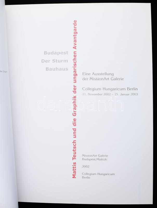 Mattis Teutsch und die Graphik der ungarischen Avantgarde: Budapest, der Sturm, Bauhaus; eine Ausstellung der MissionArt Galerie; Collegium Hungaricum, Berlin, 11. November 2002-15. Januar 2003. Szerk.: Kishonthy Zsolt, Jurecskó László. Bp./Miskolc/Berlin, 2002, MissionArt/Collegium Hungaricum. 72p. Sok-sok képpel illusztrált kiállítási katalógus Bajkay Éva német nyelvű tanulmányával, Mattis Teutsch János munkái mellett többek közt Kassák Lajos, Scheiber Hugó, Hincz Gyula, Bernáth Aurél, Moholy-Nagy László, Uitz Béla, Tihanyi Lajos alkotásainak reprodukcióival. Kiadói papírkötés.