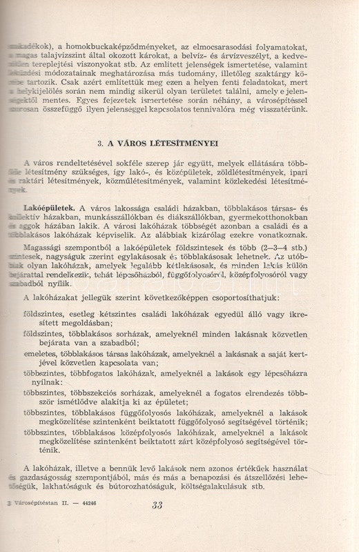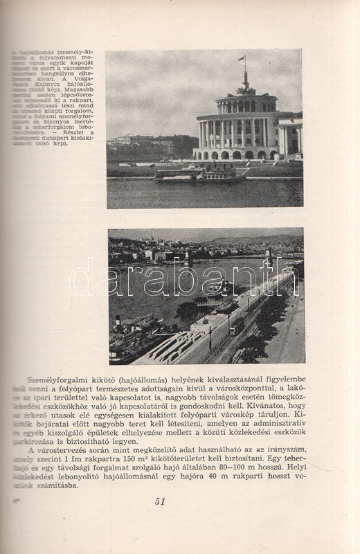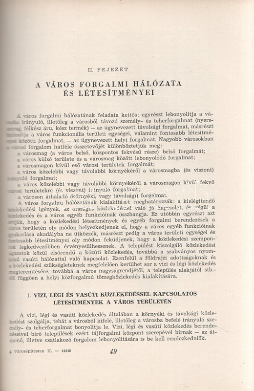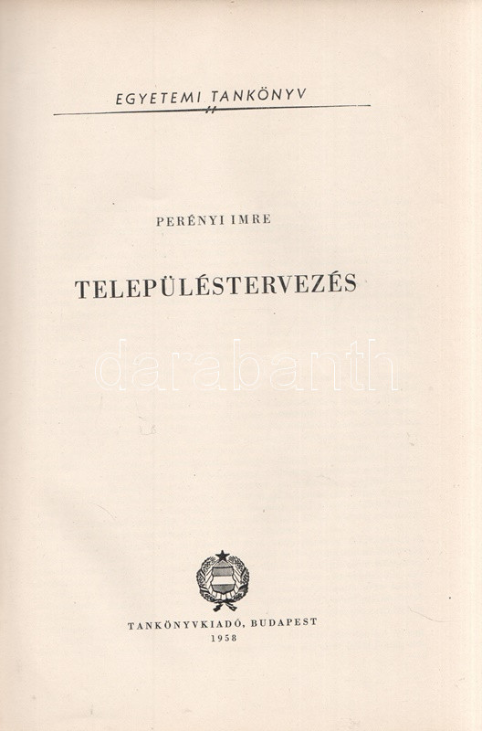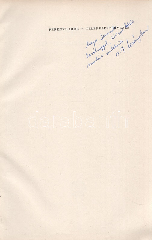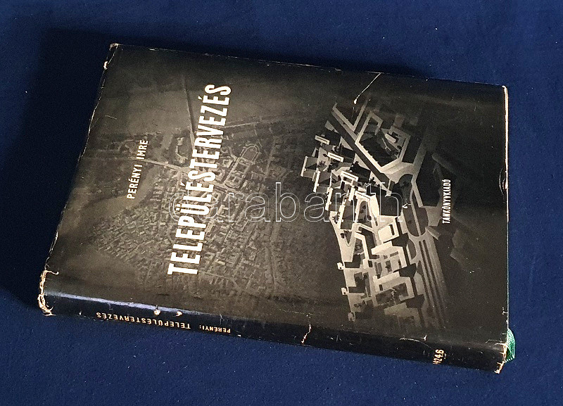 Perényi Imre: Településtervezés. (Dedikált.) Budapest, 1958. Tankönyvkiadó (Kossuth Nyomda). 392 + [2] p. Első kiadás. Dedikált: "Major Jenőnek barátsággal, közös munkánk emlékéül: Perényi Imre. IX. 17". Perényi Imre (1913-2002) építész, egyetemi tanár, a Városépítési Tanszék vezetője, Budapest főépítésze. A Moszkvában tanult szerző modernista szemléletű, szövegközti ábrákkal és felvételekkel gazdagon illusztrált urbanisztikai szakmunkája a városalapítás makroszintjén kivitelezhető építészeti tervezés nagyszerű lehetőségeit járja körül, tipologizálja a városokat gazdasági funkcióik szerint, majd a közlekedési szerkezetből kiindulva felvázolja egy lehetséges város kialakításának mozzanatait, a lakókerületektől az ipari területekig, a középületektől a bérházakig. A szerző külföldi és magyar üdvözlendő és elrettentő példák alapján különös fontosságot tulajdonít a zöldfelületek növelésének és az átlátható városszerkezet kialakításának. A munka függelékében a falutervezés illusztrált útmutatója. (Városépítéstan II.) Prov.: Major Jenő (1922-1988) településtörténész, földrajztudós, urbanisztikai szakíró. Aranyozott gerincű, illusztrált kiadói félvászon kötésben, illusztrált kiadói védőborítóban. Jó példány.