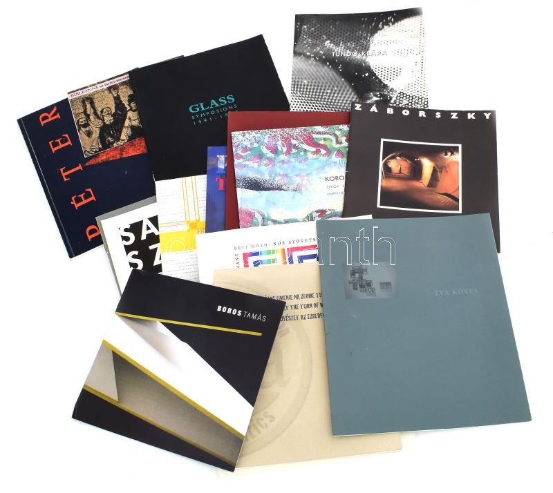 Vegyes katalógus tétel, 17 db. Brit Noah: Noé Szövetsége, Konceptuális művészet az ezredfordulón, Éva könyvek, Boros Tamás, Szász Jáno és Kovács Tamás, Saxon - Szász Supre Madism, Line-Vonal, Saxon Szász János: Dimenzió - Ceruza , Kovács Tamás László: Hommage á Miles Davis, Ponyva Trapaulin, G. Heller Zsuzsa, Korodi Luca, Záborszky, Tundó Klára, Péter Ágnes, Biblione, Glass Symposions 1991-1995 -