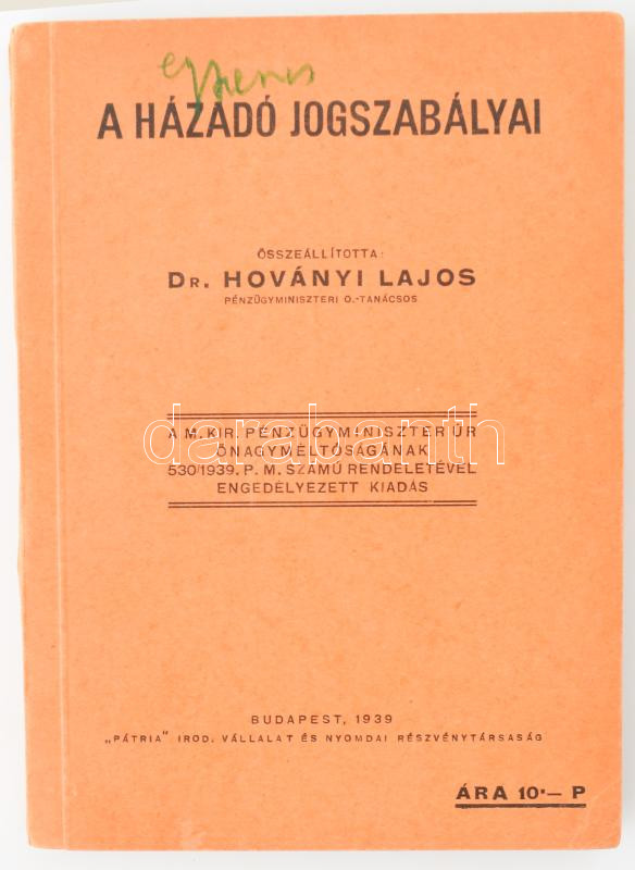 Leírás: dr. Hoványi Lajos: A házadó jogszabályai. Bp., 1939. Pátria. 336p. Kiadói papírborítóval