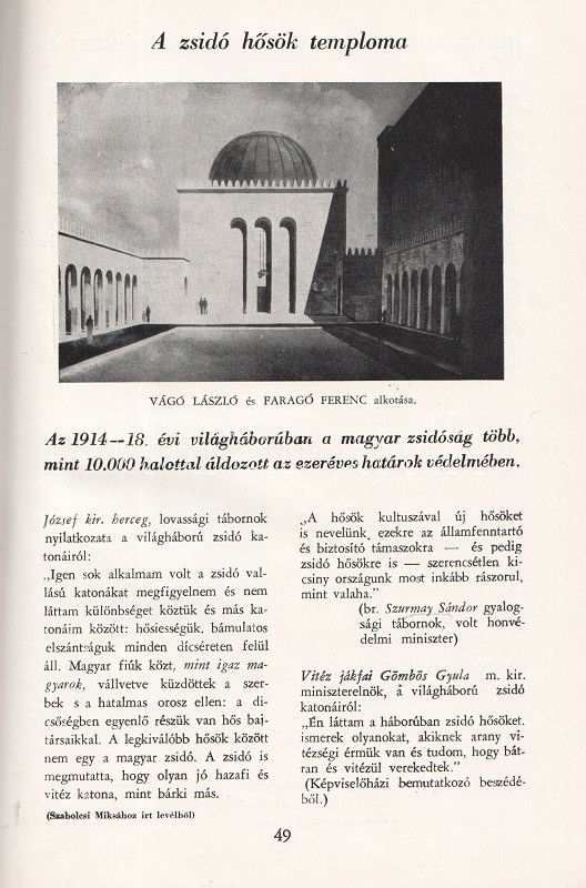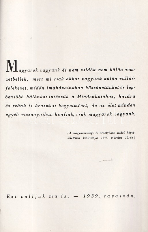 A zsidótörvények idején készült, oldalszámozáson belül számos egész oldalas és szövegközti fényképpel illusztrált kiadvány a magyarság politikai, kulturális céljaiban részt vállaló zsidó kiválóságok példájával érvel a zsidóság kirekesztése ellen. A kiadvány érdekes tipográfiai megoldása a munkában szereplő zsidó és magyar származású közéleti szereplők (költők, írók, képzőművészek, zeneszerzők, színészek, vállalkozók, országgyűlési képviselők, háborús hősök, sportolók) neveinek eltérő szedése.