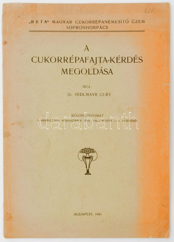 Sedlmayr Curt:A cukorrépafajta-kérdés megoldása. Különlenyomat a Kisérletügyi Közlemények XLIII (1940.) köteteb 1-6. füzetébÅ‘l. Bp., 1941, (Sopronhorpács,"BETA" Magyar CukorrépanemesÃtÅ‘ Üzem),(Bp., Pallas-ny.), 20 p. Kiadói papÃrkötés.