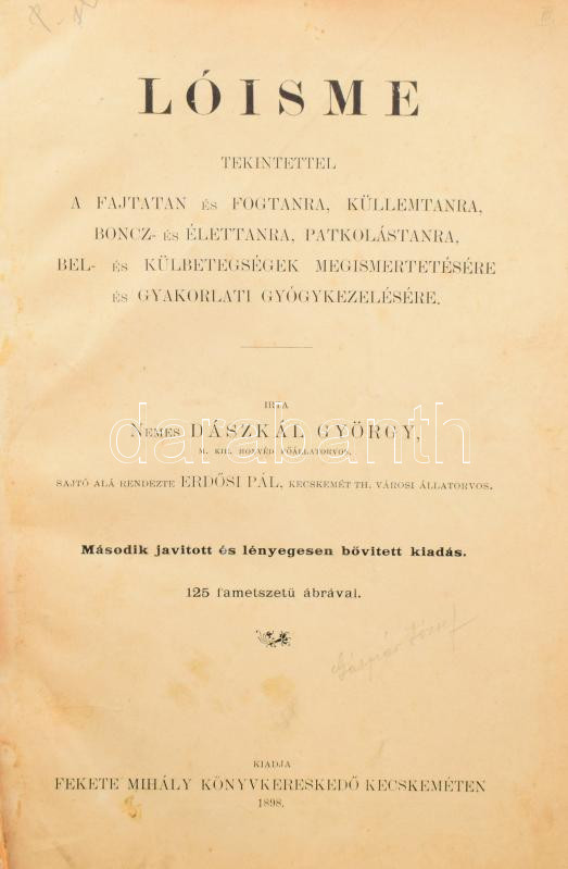Dászkál György: Lóisme, tekintettel a fajtatan és fogtanra, küllemtanra, boncz- és élettanra, patkolástanra, bel- és külbetegségek megismertetésére és gyakorlati gyógykezelésére. Írta nemes - - m. kir. hovéd főállatorvos. Sajtó alá rendezte Erdősi Pál, Kecskemét th. városi állatorvos. Kecskemét, 1898, Fekete Mihály,(Tóth László-ny.), 9 sztl. lev. + 515 p. + 2 t. 2., javított és lényegesen bővített kiadás. Kiadói papírkötés, hiányos, sérült borítóval, szétvált kötéssel, az első lapok közül a 9 sztl. levélből 5 lapot gépirattal pótoltak.
