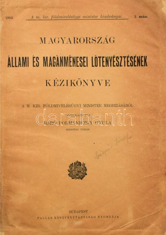 Podmaniczky Gyula, báró: Magyarország állami és magánménesei lótenyésztésének kézikönyve. A magyar kir. földmívelésügyi miniszter megbízásából összeállította - -. A m. kir. földmívelésügyi miniszter kiadványai 1903. 3.szám. Bp.,(1903),Pallas, 374 p. + 2 (színes táblák) t. Papírkötés, amatőr módon pótolt borítóval, javított lapokkal, néhány lapon szakadással, hiányzó térképpel. Ritka!