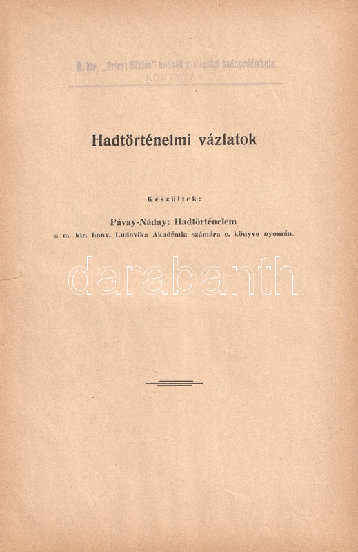 Garay Lajos: Hazánk története a szatmári békéig. Tanítási segédlet a m. kir. hadapródiskolák III. évfolyama számára. Írta Garay Lajos. A hadtörténelmi részeket írta és a vázlatokat készítette Bakó Imre. Budapest, 1942. Attila-nyomda Rt. 190 p. + 1 melléklet (16 oldalas füzetmellékletben hadtörténeti térképvázlatok). Egyetlen kiadás. Garay Lajos alezredes (sz. 1889), a Pécsi Magyar Királyi Honvéd Hadapródiskola igazgatójának történeti összefoglalása. A hadtörténeti fókuszú történeti összefoglalás a római és népvándorlás kori előzmények után a honfoglalástól a Rákóczi-szabadságharc végéig tekinti át a magyar történelmet. Valamennyi korszak a kormányzás, a jogfejlődés és a gazdaság áttekintésével kezdődik, a szerző ennek nyomán dolgozza ki a diplomácia- és eseménytörténetbe ágyazott magyar hadtörténetet. A címlapon, az utolsó oldalon és a melléklet címlapján régi gyűjteményi bélyegzés, az első előzéken katonaiskolai kölcsönzőjegy. Néhány oldalon aláhúzások. Hiányos, sérült gerincű kiadói félvászon kötésben. Jó példány. Ritka.