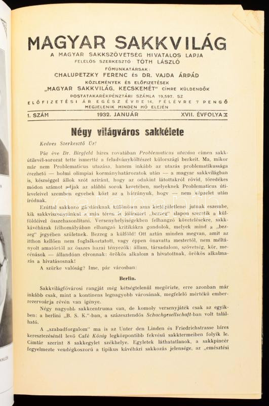 1932 A Magyar Sakkvilág XVII. évfolyamának összes. száma bekötve. Félv... https://www.darabanth.com/hu/498-Gyorsarveres/498.0/Konyvek/Konyvek-Sport-sakk-hegymaszas~2000122/1932-A-Magyar-Sakkvilag-XVII-evfolyamanak-osszes-szama-bekotve-Felvaszon-kotesben~II3363586