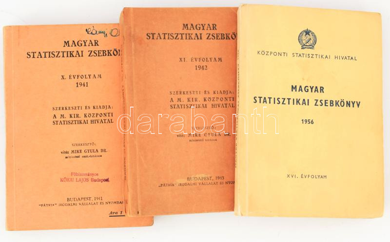 Leírás: 3 db Magyar Statisztikai Zsebkönyv 1941, 1942, 1956. szerk: Mike Gyula.