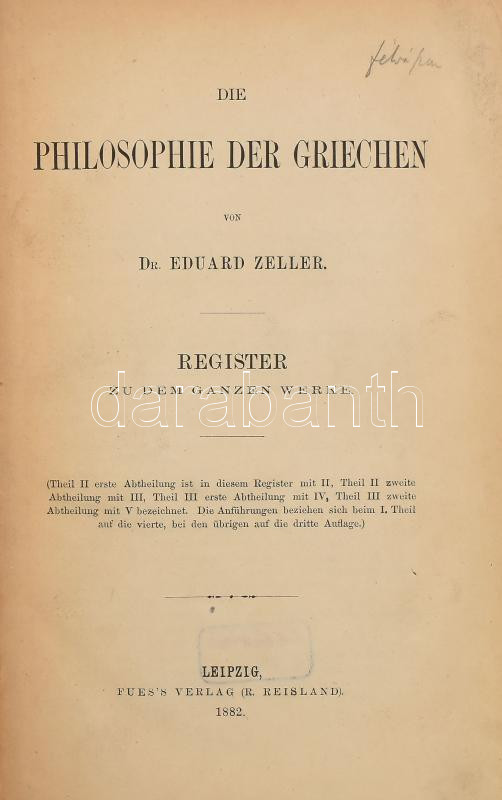 Eduard Zeller: Die Philosophie der Griechen. Register zu dem Ganzen Werke. Leipzig, 1882, Fue's Verlag (R. Reisland.) Átkötött félvászon-kötés, kissé kopott borítóval, sérült gerinccel.