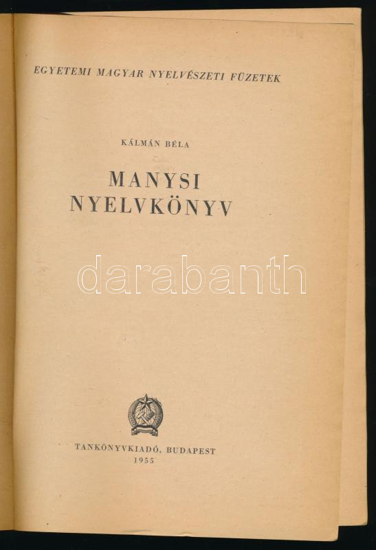 Kálmán Béla: Manysi nyelvkönyv. Egyetemi magyar nyelvészeti füzetek. Bp., 1955, Tankönyvkiadó. Megjelent 600 példányban. Kiadói papírkötés, kissé kopottas állapotban.