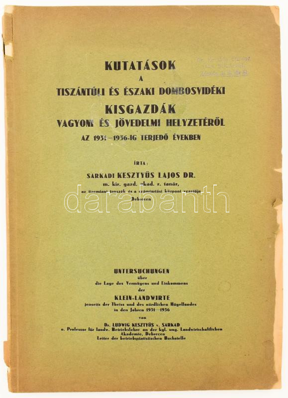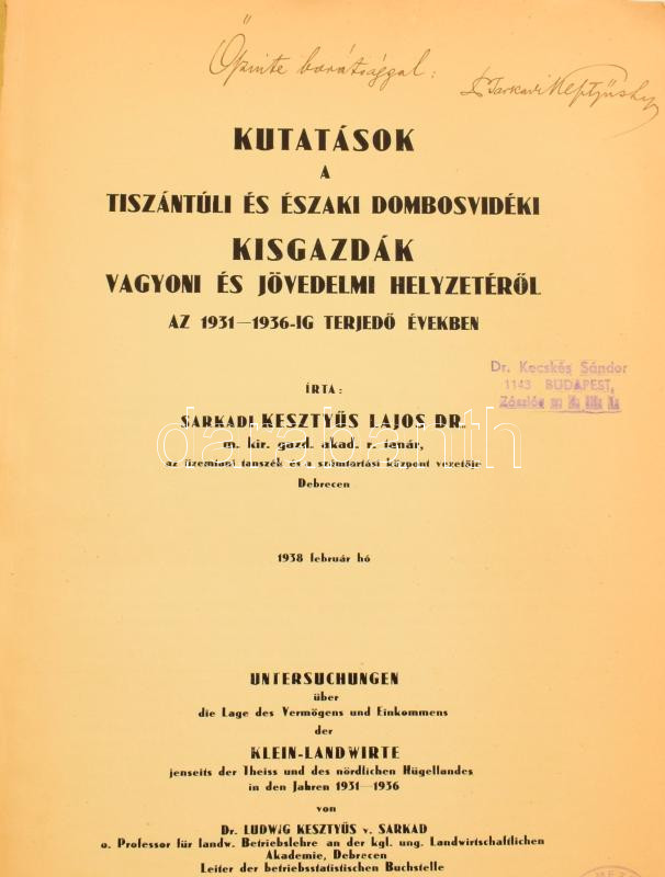 Sarkadi Kesztyűs Lajos: Kutatások a tiszántúli és északi dombosvidéki kisgazdák vagyoni és jövedelmi helyzetéről az 1931-1936-ig terjedő években. DEDIKÁLT!bDebrecen, 1938., Városi Nyomda, 68 p. + 18 (köztük 17 kihajtható) t. Kiadói papírkötés, kissé sérült borítóval és kissé sérült gerinccel, régi tulajdonosi bélyegzésekkel.