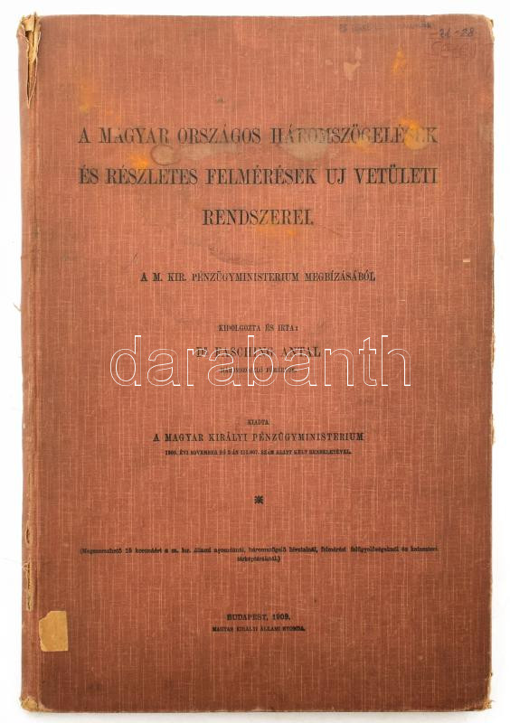 Fasching Antal: A magyar országos háromszögelések és részletes felmérések új vetületi rendszerei. A M. Kir. Pénzügyminisztérium megbízásából kidolgozta és írta: - - . Bp., 1909, M. Kir. Pénzügyminisztérium (M. Kir. Állami Ny.), 201+(1) p.+ 4 (kihajtható) t. Kiadói egészvászon-kötés, kissé viseltes állapotban, foltos borítóval, sérült gerinccel, helyenként kissé sérült, foltos lapokkal, intézményi bélyegzőkkel.