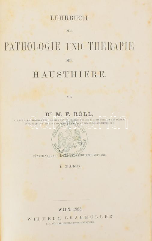 Röll, M. F.: Lehrbuch der Pathologie und Therapie der Hausthiere. I-II. köt. [Egybekötve]. Wien, 1885, Wilhelm Braumüller, IX+(1)+719 p.; VIII+582 p. Aranyozott gerincű félbÅ‘r-kötésben, kissé sérült, kopottas borÃtóval és gerinccel, belül nagyrészt jó állapotban, helyenként kissé foltos lapokkal, korabeli intézményi bélyegzÅ‘vel ("Königliche Preussische Militair Rossarzt-Schule").