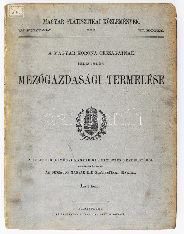 A magyar korona országainak 1893. és 1894. évi mezőgazdasági termelése. Magyar Statisztikai Közlemények. Új folyam XI. köt. Bp., 1895, Orsz. M. Kir. Statisztikai Hivatal (Athenaeum-ny.), 2 sztl. lev.+ 171+(1) p. Kiadói egészvászon-kötés, viseltes, kissé sérült, foltos borítóval és gerinccel, kijáró elülső szennylappal, régi intézményi bélyegzővel.