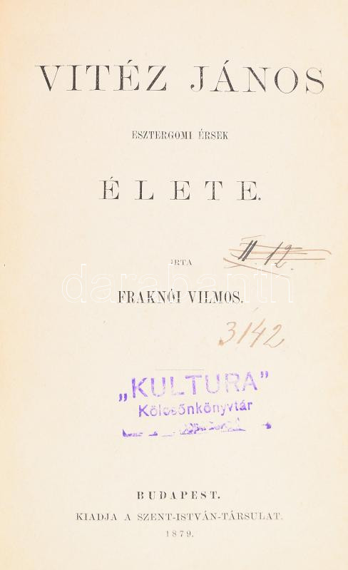 Fraknói Vilmos: Vitéz János esztergomi érsek élete. Házi könyvtár. XXX. Bp., 1879., Szent-István-Társulat, (10)+247 p. Átkötött félvászon-kötés, kissé kopott borítóval, a gerincen címkével, az elülső borító felső sarkán.
